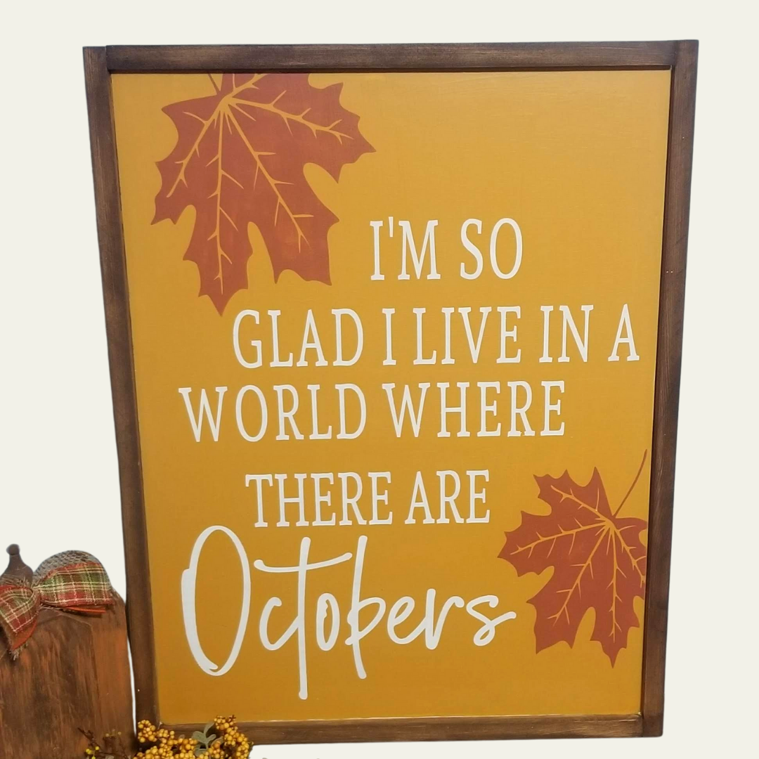 I'm So Glad I Live In A World Where There Are Octobers hand-painted framed wood sign