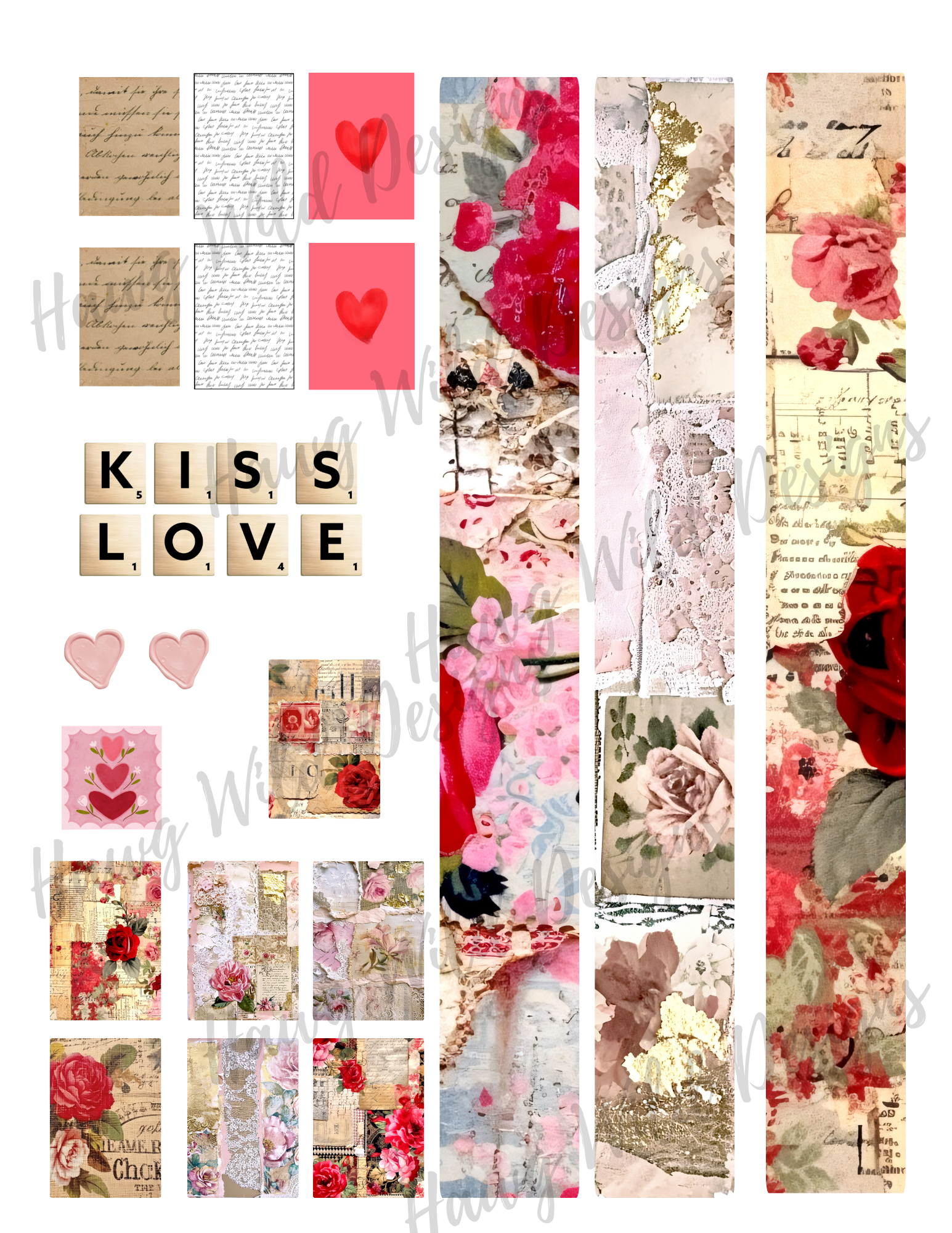 - Coordinating Ephemera like labels, tickets, hearts, florals, lace-style elements, and themed embellishments